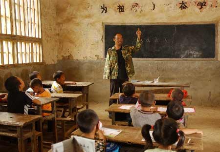 在湖南湘西土家族苗族自治州保靖县与重庆秀水县交界处的友谊小学,何美基老师在给一年级的学生上课。