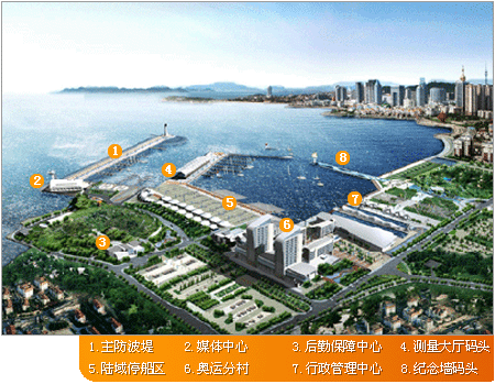 奥运纪念墙码头 主防波堤码头 测量大厅码头 陆域停船区