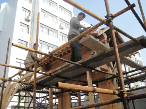 为造出原汁原味的老浮山所,建筑方从曲阜引进了有丰富仿古建筑建设经验的施工队。记者在施工现场看到,十多个工人正在刨木板、磨石板、磨青砖,工地上已立起6座木制和青砖砌成的建筑。门楼工艺最难的部分是砖雕和雕花,正由60个工匠加班赶制。