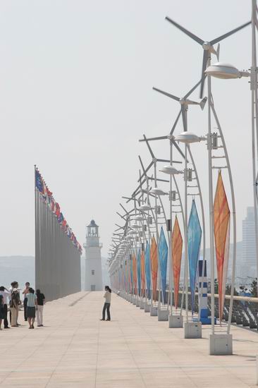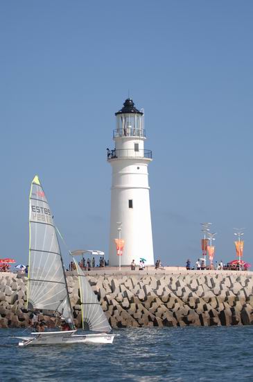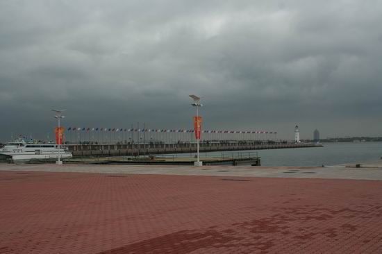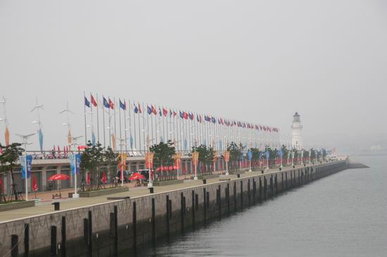 主防波堤位于港区的南侧,全长534米,宽47米,结构形式外侧采用斜坡式结构,内侧采用沉箱重力式结构。主要功能是防御外海波浪对整个港区的侵袭,保证港区内水域建(构)筑物的安全及泊稳条件满足比赛要求;同时,主防波堤内侧直立岸壁码头可停靠各种型号游艇,并提供维修、船库等功能用房。
