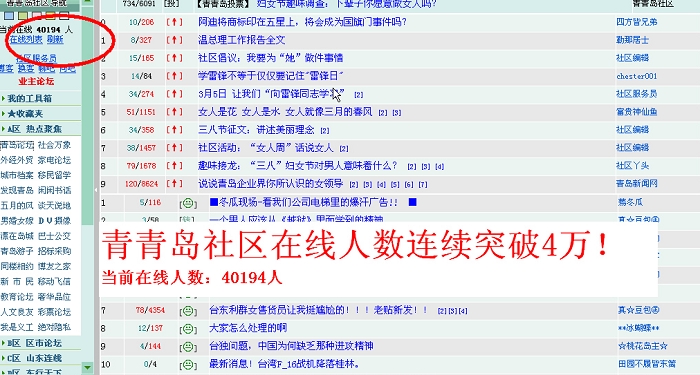 青岛新闻网讯 2008年3月5日15时许,由青岛新闻网创办的青青岛社区同时在线人数再次突破4万人,达到40194人。3月以来,青岛新闻网虚拟社区最高同时在线人数纪录多次突破4万人,注册用户达到133万,创出历史新高。