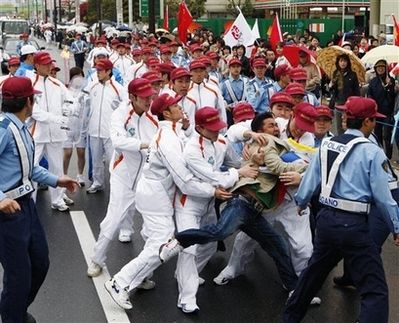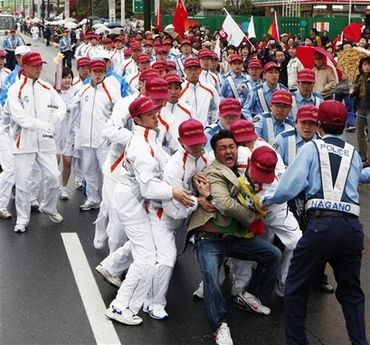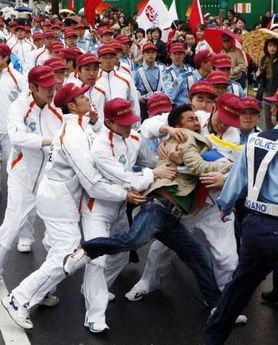核心提示:北京时间上午8点30分,北京奥运圣火在日本长野的传递正式开始,著名兵乓球运动员福原爱传递火炬过程中遭遇一男子抢火炬,护卫队身手敏捷,迅速将该名男子制服。据悉,该名男子手持藏独旗帜。