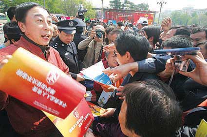图为冯巩在军博前的广场上向市民发放宣传材料。摄/记者曹博远