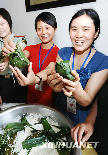 6月4日,武警江苏总队医院官兵和来自四川地震灾区的伤员家属、社区志愿者欢聚一堂,一起包粽子,并将煮好的粽子送到“爱心病房”的伤员手中,共迎端午节。 新华社发(王卓 摄)