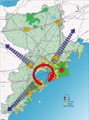 拥湾发展:以胶州湾为生态保护核心,以崂山风景名胜区、小珠山风景名胜区为生态重点,依托白沙河、墨水河、大沽河、洋河四条主要河流构筑生态控制带,积极加强陆域河流的治理和保护,科学规划利用并有效保护好胶州湾的生态岸线与港口岸线。重点强化胶州湾沿岸团岛-老港区、四方李沧西部地区、临空经济区、高新技术产业新城区、胶州沿海地区、红石崖地区、石化产业区、前湾港地区、海西湾地区等中心组团的分工合作与协调发展。构建以环胶州湾地区为核心圈层,以即墨、胶州、胶南为内圈层,以莱西、平度及临近的海阳、莱阳、高密、诸城为外圈层的多圈层拥湾发展格局,积极促进各圈层的合理分工与有机协作。