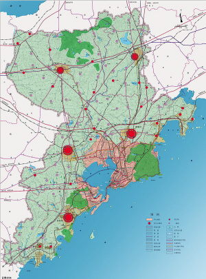 组团布局:严格保护海湾、山体、河流、湿地等自然生态地区,有效保护和控制农业生态地区及各类重大市政、交通走廊,合理控制城镇发展规模,严禁城镇空间的随意扩张和无序蔓延。重点建设中心城区和胶南、胶州、即墨城区以及外围的平度城区、莱西城区,科学规划建设滨海沿线的琅琊组团、鳌山组团、田横组团。