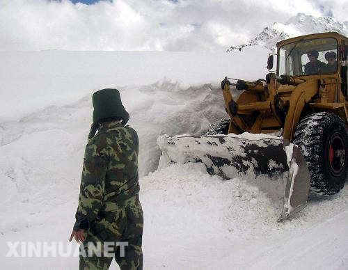 持续强降雪和雪崩造成川藏公路中断以后,负责公路养护并担负抢通任务的武警交通四支队出动兵力120余人次,装载机6台,自卸车4台,从6个点同时推进,对川藏公路进行抢通。(张申酉)