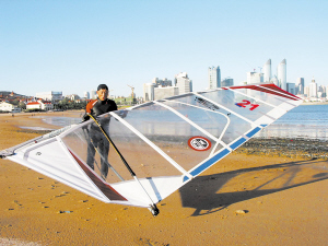 大风将三浴帆船爱好者手中的帆船凌空吹起,一个人就能推着搬运(赵健鹏 摄)