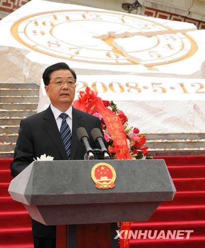 [中共中央总书记、国家主席、中央军委主席 胡锦涛]:同志们,朋友们,今天我们在这里隆重集会,纪念四川汶川特大地震一周年,向在地震灾害中不幸罹难的同胞们,向为夺取抗震救灾斗争重大胜利而英勇献身的烈士们,表达我们深切的思念。