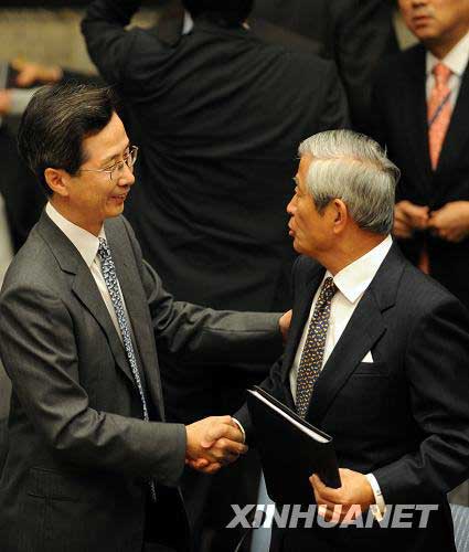 6月12日,韩国常驻联合国代表朴仁国(左)和日本常驻联合国代表高须幸雄在会后握手。当日,联合国安理会一致通过第1874号决议,对朝鲜5月25日进行核试验表示“最严厉的谴责”,并要求朝鲜今后不再进行核试验或使用弹道导弹技术进行任何发射。 新华社记者申宏摄