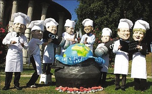 抗议者戴着G8领导人模样的面具,将“地球”放在一口锅里煮,以此抗议G8应对气候变暖不力。