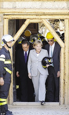 德总理默克尔(中)参观拉奎拉附近遭受地震破坏的村庄。