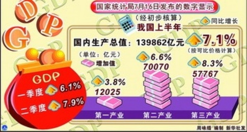 中国经济网综合报道,国家统计局7月16日公布,我国上半年国内生产总值(GDP)同比增长7.1%,二季度增长7.9%,扭转了此前连续7个季度的回落态势,用数字证明我国经济刺激一揽子计划取得了明显成效,经济形势企稳回升,为实现全年经济增长“保8”目标奠定了坚实基础。与此同时,经济恢复过程中出现的新问题受到高度关注,下半年政策走向也成为各方瞩目的焦点。