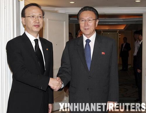 8月22日,在韩国首尔,韩国统一部长官玄仁泽(左)与朝鲜劳动党中央统战部长金养健握手。当日,玄仁泽与金养健举行会晤。这是自去年2月李明博政府上台以来韩朝政府高级官员间的首次会晤。新华社/路透