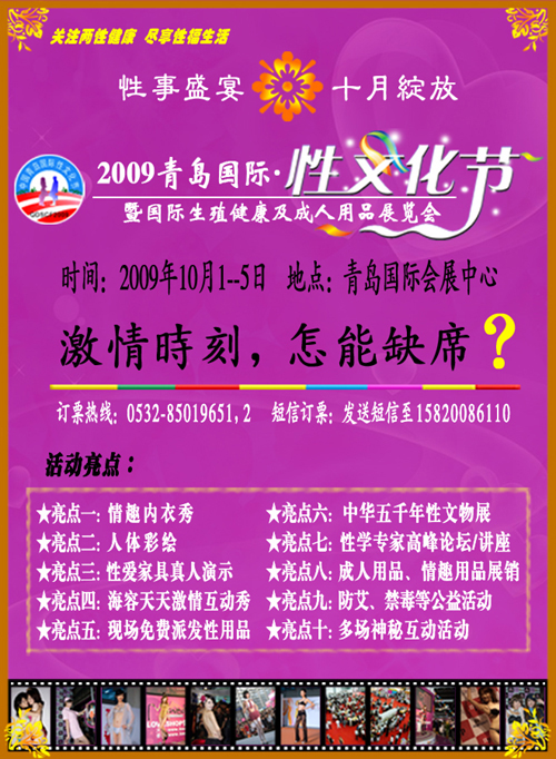以“关注两性健康• 尽享性福生活”为主题的“2009中国青岛国际性文化节暨国际生殖健康及成人用品展览会”(简称: 2009青岛性文化节)将于2009年10月1日-5日在青岛国际会展中心盛装上演!