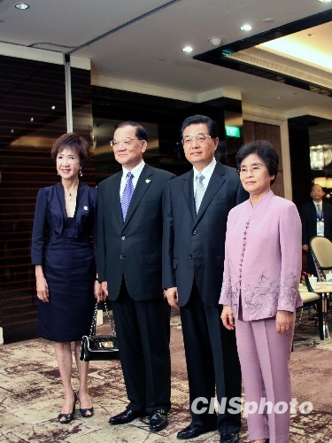 11月14日上午,中共中央总书记胡锦涛在新加坡会见中国国民党荣誉主席连战。图为胡锦涛和夫人刘永清与连战和夫人连方瑀合影。中新社发周兆军 摄