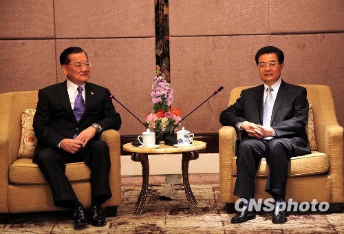 胡锦涛表示,今天有机会同连主席再次见面,我感到十分高兴。我再次祝贺您继续担任中国国民党荣誉主席。连主席一直关注并积极推动两岸关系发展,我们赞赏您在这方面所持有的鲜明态度。
