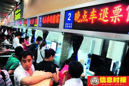 京广线韶关段发生泥石流 45列车晚点3小时。图为广州火车站加开到10个退票窗口,供旅客退票。陆明杰 摄
