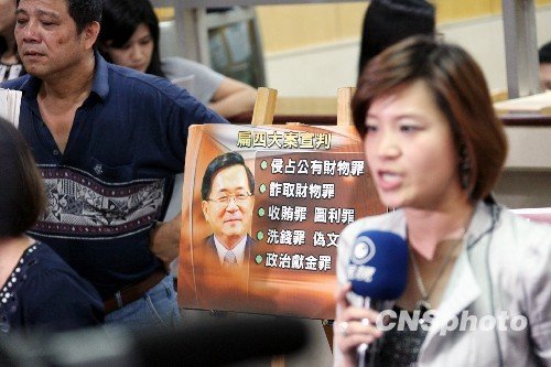 资料图:2009年9月11日下午,涉及公务机要费、龙潭购地、贪污等案,陈水扁、吴淑珍夫妇被台北地方法院一审判处无期徒刑,褫夺公权终身。许多台湾媒体制作小看板,在台北地院内介绍陈水扁等涉案情况。 中新社发 黄少华 摄