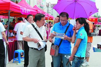 记者注意到,在各个展板前均围满了前来淘房的市民,中介工作人员忙得不亦乐乎,有的给购房者详细介绍房源信息,有的热心地为拆迁居民提供合适房源。家住在八大湖小区的姜大爷面临拆迁,希望拆迁后能在沿海一线找个安静的封闭小区,但由于年近八旬行动不便,孩子又在国外,老两口没法四处去看房,正好家门口办起了二手房交易大集,于是一大早就过来登记房源信息以及购房意愿。
