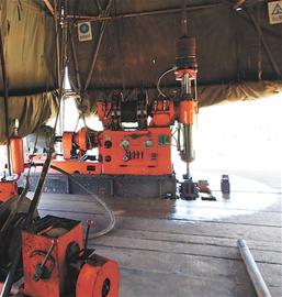 帐篷内,最吸引记者的,就是里面正在作业的钻井机器了,机器飞转,四周迸射出一些水花,一名身穿绿色军装的战士正在边上不时查看操作着。他告诉记者,机器正在钻井,取上地下的岩石进行分析,看看含金量如何,查找金矿。