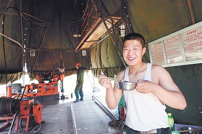 从北泊村里穿过去向东走,步行十分钟,绕到山这边,两个“绿塔”远远地出现在了记者面前。“绿塔”高约二十多米,两“塔”相隔十多米。走上前去,发现“塔”之所以呈绿色,是因为上面蒙着绿色的帆布,像一个巨大的帐篷。大帐篷里面,有四五个战士,由于天气炎热,多数穿着背心。他们正在吃午饭,看到记者走过来,一名靠近帐篷口的战士端着饭盒,有点警惕地问“有什么事? ”记者表明来意后,这名战士又透出一股热情。
