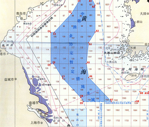 黄海位于中国大陆与朝鲜半岛之间,海区南北长470海里,东西宽360海里,面积约38万平方公里。在黄海,中国面临着与朝鲜和韩国的大陆架与专属经济区划界。目前划界尚未确定,只有2001年前定的中韩渔业协定做了暂时性的安排,图中蓝色区域被定为“共同渔区”。