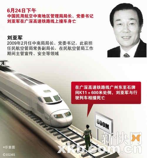 据一名知情人士透露,刘亚军于6月24日下午在广深高速铁路线的广州东至石牌区间K11+600米处与一辆行驶的列车发生相撞,当场身亡。接到群众报警后,广铁公安部门立即派出民警前往现场勘查,调取现场附近的监控探头录像查看,同时,对死者身份进行核查工作。经过核查,证实死者为中国民航局中南局局长、党委书记刘亚军。