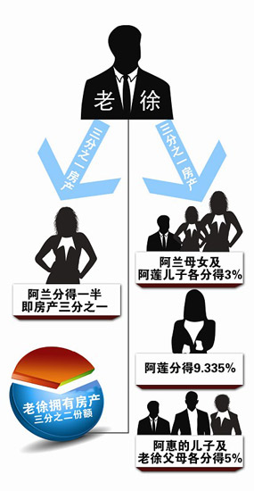 据此,法院酌定老徐在讼争房所占的三分之二份额,先由其配偶即阿兰分得一半即三分之一,阿莲分得9.335%,其余的由阿兰母女及阿莲儿子各分得3%,阿惠的儿子及老徐的父母各分得5%。(记者 沈华铃)