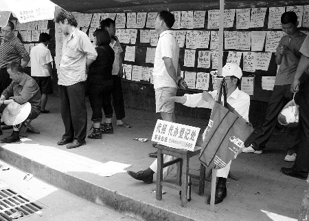 由于不是合法的劳务市场,沈阳路劳务市场里经常能见到一些招聘另类职位的非法招聘广告:“东北小哥”、“网游代练”等赫然在列。相关部门表示,他们经常对这个劳务市场进行查处,但无奈的是,这个非法劳务市场查完后又会死灰复燃。