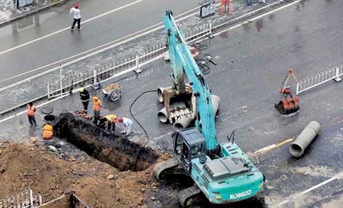 截至发稿时,中铁六局的工作人员已经用无机料将大坑填充了一大部分,保证路面没有出现“陷阱”。(实习生 王妍)