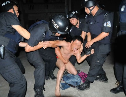 2010年7月8日凌晨,广西南宁380多警力在横县一举捣毁了一个以闭毓宁、闭廷醒等人为首的涉黑涉恶犯罪团伙;图为“老大”闭毓宁在被押到楼底时候挣扎,很不配合,期间民警给他穿衣服他一再拒绝