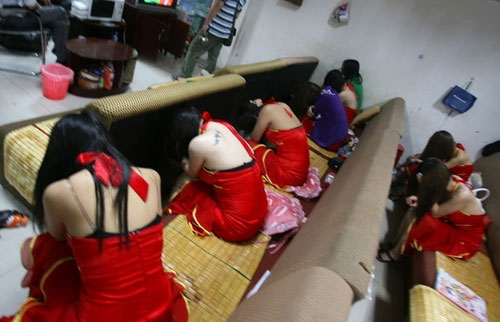 6月22日晚,南宁市公安局统一部署,对该市四个城区的游戏机赌博窝点及涉黄场所进行查处行动。在南宁仙葫大道18号金富盈大酒店的休闲会所内,10多名穿着暴露的女子坐在沙发上,逐个接受民警的检查。