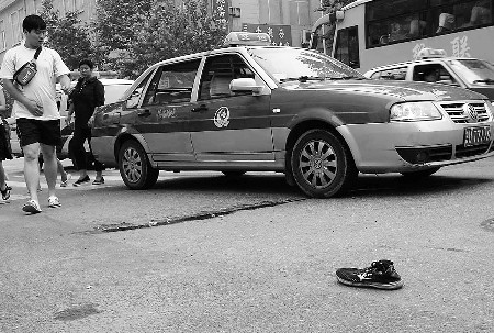22日下午4点半左右,记者接到热线,华阳路一辆出租车把行人撞飞。记者迅速赶到现场,发现肇事出租车停在路边,车灯闪烁,110警车停在旁边。记者看到,出租车车头右前方还带着斑斑血迹,车右前方路面上有一摊巴掌大的血已经干掉。出租车后面的斑马线上有一米半左右的刹车痕迹。在出租车前方5米开外,记者发现了一只黑色鞋子,后来鞋子被市民踢到出租车附近。