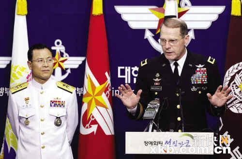 20日,美军少将约翰·麦克唐纳(右)和韩国海军少将金景植正就联合军演召开新闻发布会。