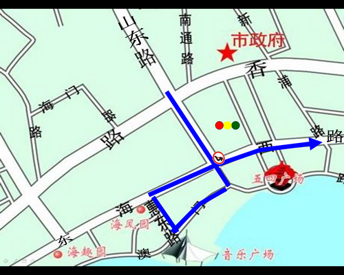 征求具体方案是:沿山东路北向南行驶至东海路机动车,禁止由山东路左转驶入东海路,需左转车辆可直行通过路口,沿香洲路、澳门路、惠东路呈环形驶入东海路,这种措施可以减少路口的交通冲突点,解决因左转车辆滞留而影响其它方向车辆行驶的问题,从而提高路口单位时间内的通行量。
