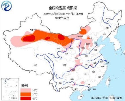 中央气象台26日继续发布高温蓝色预警。预计,26日,北京大部、天津西部、河北中西部、陕西东北部和关中地区、山西北部、重庆中西部、湖南大部、湖北东南部、江西西北部、广西东北部、广东西部和东北部等地仍有35℃以上的高温天气,局地最高气温可达37~38℃;内蒙古中西部、甘肃中西部、新疆吐鲁番盆地及南疆盆地大部等地将有35~37℃的高温天气,局部地区最高气温可达42℃以上。