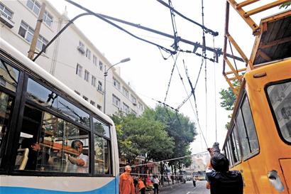 “当时就听到‘哧啦’一声响,上空的电车线冒出了电火花,这条支架随之就耷拉下来了。”附近一名小店店主告诉记者,当时一辆5路电车刚好从这里驶过,电车线就断了一根,随后电车都无法通行了。大约一个小时后,总站上的电车全部发出后,抢修人员开始维修电车线和支架,交通恢复正常。