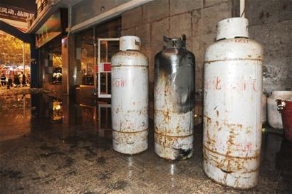 记者看到店内餐厅桌椅几乎完好无损,但转到店后面看到,厨房门口摆着3个1.5米高的液化气罐,中间一个已经被烟火熏黑,旁边一个垃圾桶底部被烧出一个大洞,厨房的铁防盗门下部被气浪鼓开,厨房内一片狼藉,大小汤锅散落在地上,天花板上的板子也掉落下来。