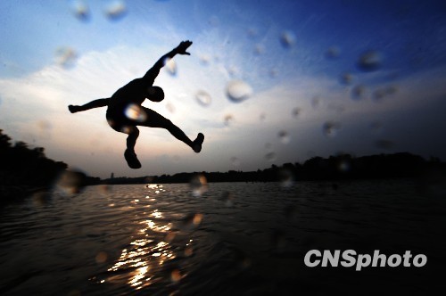 8月2日,江苏扬州市连续多天出现37℃以上的高温天气。当日傍晚,许多扬州市民来到当地的“天然游泳场”——保障湖中戏水消暑。 中新社发 孟德龙 摄