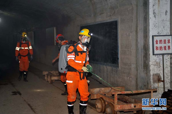 8月7日,在山东招远玲南矿业有限责任公司罗山金矿,救援人员在巷道口整理装备。新华社记者 朱峥摄