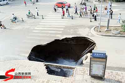 最早在今晨7:30分左右,省人民医院与东岗路交界处的人行便道上发生地面塌陷,路面先后出现两个“大坑”,最大的“坑”直径长度能容下两辆公交车,坑深约7、8米。9:20分许,山西新闻网记者正在现场拍摄“大坑”图片时,省人民医院东侧感染疾病门诊楼发生塌陷。据现场人员称,塌陷速度比较慢,里面的人全部撤出。