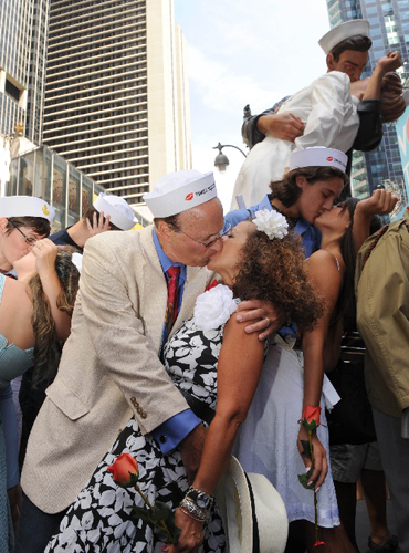 美国纽约时报广场14日举行大规模接吻比赛,再现“胜利日之吻”的经典瞬间,并以此纪念二战结束65周年。