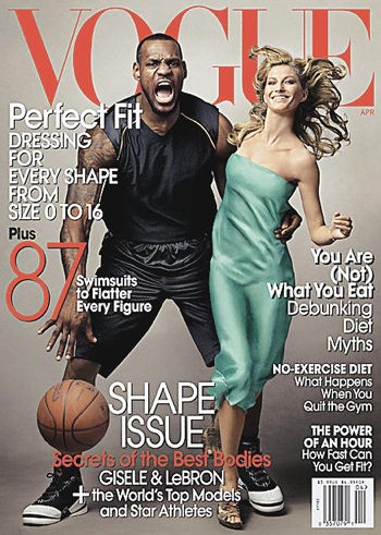 NBA球星勒布朗·詹姆斯与巴西超模吉赛尔·邦辰一起出现在2008年4月的《Vogue》杂志封面。随着这期杂志的发行,读者纷纷表示,这张身高206厘米,体重118公斤的黑巨人揽抱苗条的白人美女名模纤腰的封面照让人联想到电影《金刚》。美联社也描述说,詹姆斯弯曲站立,张大嘴巴露出整个牙齿的造型酷似大猩猩。《时尚》方面当初以“黑人首次登上杂志封面”来宣传4月号杂志封面的意义,但当事态扩散之后解释说:“只是为了祝贺在各自领域登上最高位置的两位超级明星而让他们上了杂志封面。”