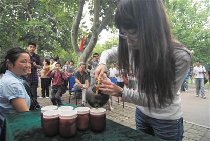 早报讯 “妈妈,你辛苦了,进了大学我就长大了,你可以放心了。”昨天上午,在青岛科技大学新生报到现场,高分子学院别开生面地摆出一排桌椅和茶具,鼓励新生们在入学第一天为操劳的父母敬茶(上图)。面对突如其来的这杯茶水,不少父母都激动地流下眼泪,新生们也通过这杯“感恩茶”表达出了对父母的爱,完成了“成人礼”。