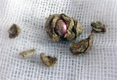 石头取出来后,李明华用血管钳敲了敲,外边竟然掉下了一层,随后他使劲一敲,外边的壳全掉了下来,里边还包着一个褐色的东西。“里边这个东西是个珠子。”李明华推测说,可能当年,刘青把这颗珠子塞进了鼻孔,当时没有取出来,时间长了在里边形成了结石。 (记者 陈珂 摄影报道)