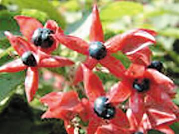 3、(投票选号133)学名:海州常山,别名:臭梧桐、红五星。落叶阔叶类小乔木,或呈灌木状,高可达8米。单叶对生 。伞房状聚伞花序着生顶部或腋间,花冠细长筒状,白色或粉红色。核果球状,熟时紫色。整个花序可同时出现红色花萼、白色花冠和蓝紫色果实的丰富色彩。花期6-7月,果期10-11月。