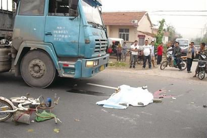 昨天下午1时许,记者赶到现场看到,妇女的尸体还在地上,周围满是血迹,交警在尸体上盖了一块塑料布。一辆女式自行车停在路中央,前轮和车筐都已经变形,车把上挂着一个布包。一辆内蒙古籍的大货车斜停在路上,车头和车尾分别在双黄线两侧。几名交警有的在疏导交通,有的在勘察现场。记者看到,肇事司机显得很紧张,记者上前询问情况,但他什么也不肯说。