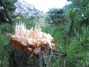 葛师傅告诉记者,从前些天开始,他就留意到山坡路边出现成片被人拦腰砍断的松树。“那都是网鸟的不法分子为飞鸟设下的陷阱。”葛师傅说,迁徙的飞鸟一般都是贴山脊飞行,不法分子利用飞鸟的这个习性,把山脊的树丛拦腰砍倒一片,然后在这个“空当”架起大网,飞鸟觉着这片树林比较低,就会飞进来自投罗网。下午1时许,记者根据葛师傅的指引,从银川西路上山,沿山间小路走了半个多小时,就看到多棵被拦腰砍断的松树,为掩盖刚砍断的新茬,有人还特意在上面盖了枯草。