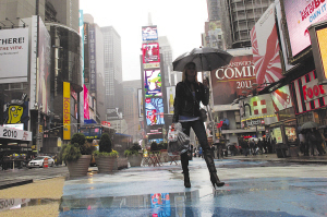 纽约近日气温骤降,最低只有12摄氏度,一名行人冒雨走在时代广场上。